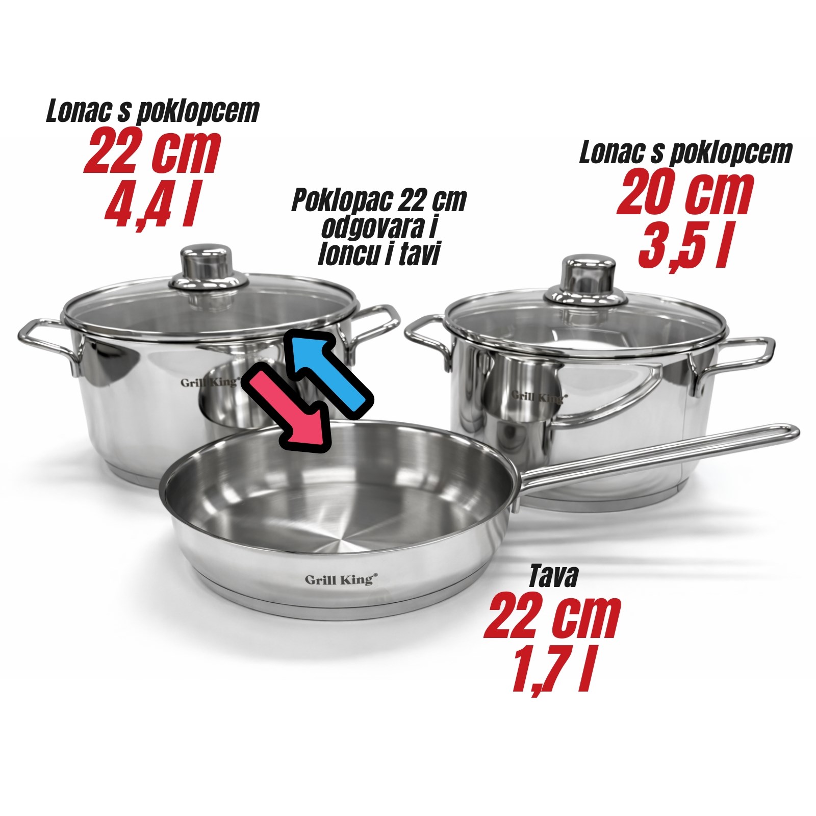 Izrađen od kvalitetnog nehrđajućeg čelika, set je otporan na svakodnevnu upotrebu i jednostavan za održavanje. Pogodan je za sve vrste ploča, uključujući indukciju, pa ga možeš koristiti gdje god treba. Pametno osmišljen, štedi prostor i vrijeme, a jedan poklopac odgovara na više posuda, što znači manje pribora i više praktičnosti u kuhinji.